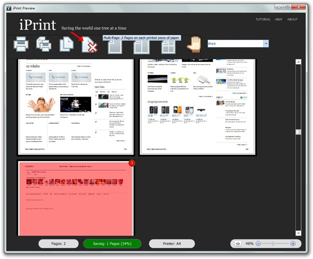 Caso não queira que alguma página seja impressa, basta selecioná-la e clicar no quarto ícone da barra, o qual é responsável em marcar o conteúdo que não será enviado para a impressora. Ao fazer isso, o item selecionado fica em vermelho, avisando o usuário que aquela folha não sairá na impressão.
